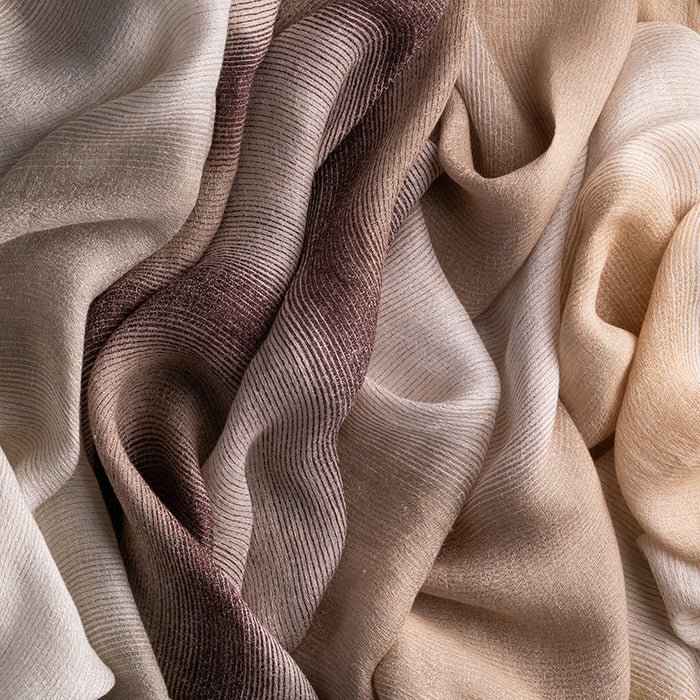 Details: Crafted from the finest linen fibres, this elegant double-width jacquard woven sheer drapes gracefully with a soft ombre horizontal stripe of four tonal shades that fades in and out, gently filtering light and creating a dreamy, diffused glow at windows. The ombre stripe has a beautiful, softly textured appearance created by the fine warp yarns that float across the weft to break up the stripe. For windows less than c. 2.9m tall, this fabric can be railroaded for a vertical striped ombre, or it can be hung so the stripe runs horizontally.