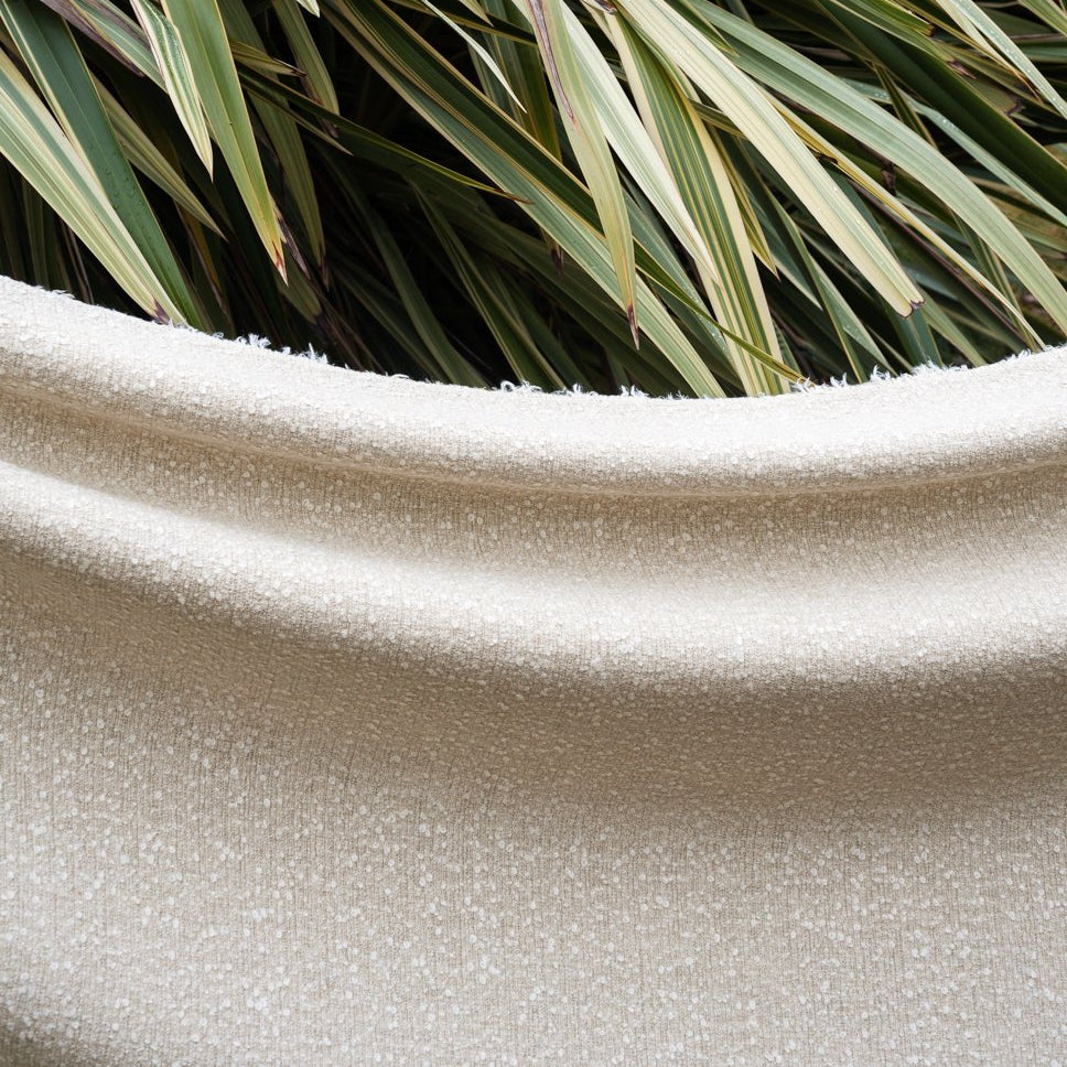 Description: A textural fabric is crossed by a bouclé yarn. The sweeping and discontinuous movement of the thread highlights the exuberance of the natural raw materials typically used in traditional arts and crafts, in which irregularity is an intrinsic element of the fabric preciousness.