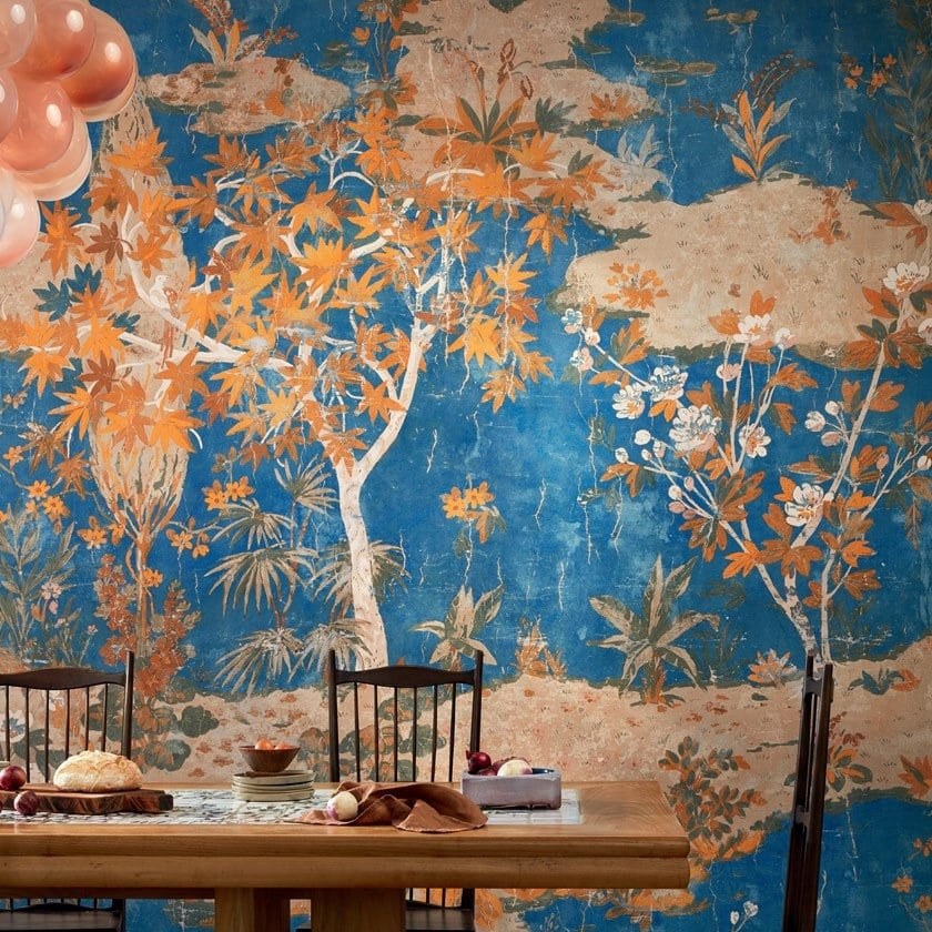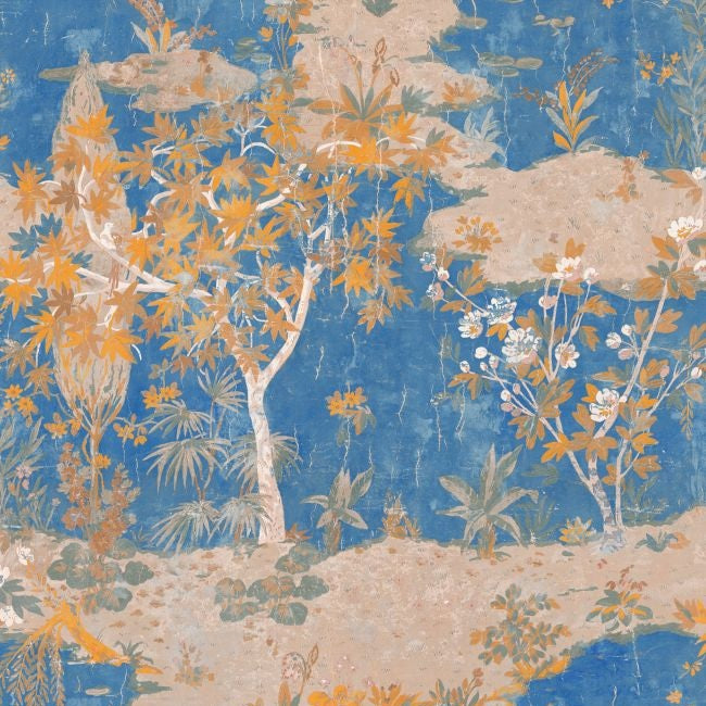 Mediterranean whitewash and coloured plaster dance on the sun-kissed walls of the spice-scented alleyways. Mischievously, they scatter their pigments, tanned by the midday sun. Their colours, some of which are patinated, evoke an earthiness, ancient walls along which feline tails sway, a revisited imaginary world of palaces revealing their mineral quality. Vinyl succeeds in creating a chalky, almost sand-like, matt effect that resembles whitewash. This collection is based on two categories of plain coverings, with warm colours on the one hand, and a mineral travertine on the other, along with three panoramics.