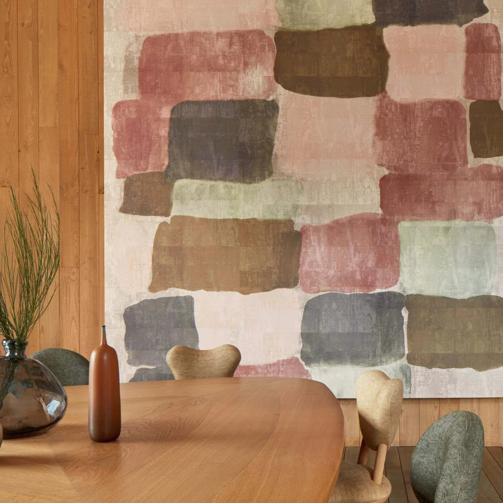 Our famous coated raffia is the subject of a second artistic residence, in a workshop where both the power of gestures and a vibrant creative energy flourish. The initial colour palette is extended with bright shades marked by the passage of longer days, almost bleached by sunshine. A feeling of gentle freshness emanates from its artisanal narratives and its dappled, plant-based weave. In this vinyl collection, additional colours join the original shades created during the artist’s workshop. In addition, panoramic coverings feature coated raffia in their oversized tableaux.