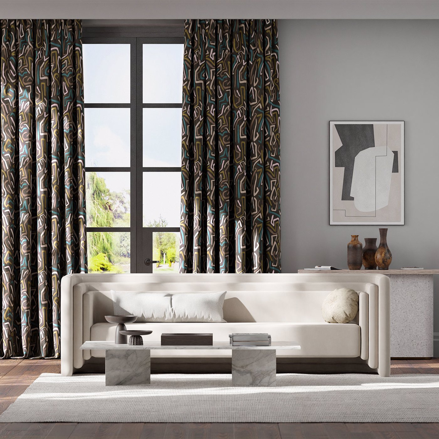 Description: A fabric interpretation of the rhythmic beats that inspired our Melodic wallpaper, Synchronic is embroidered with multicoloured crewel stitching on a linen mix ground.