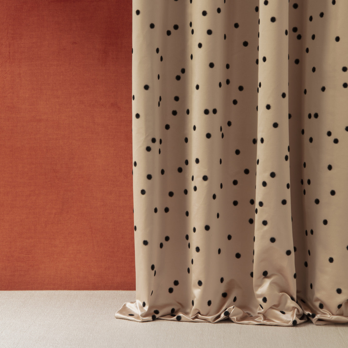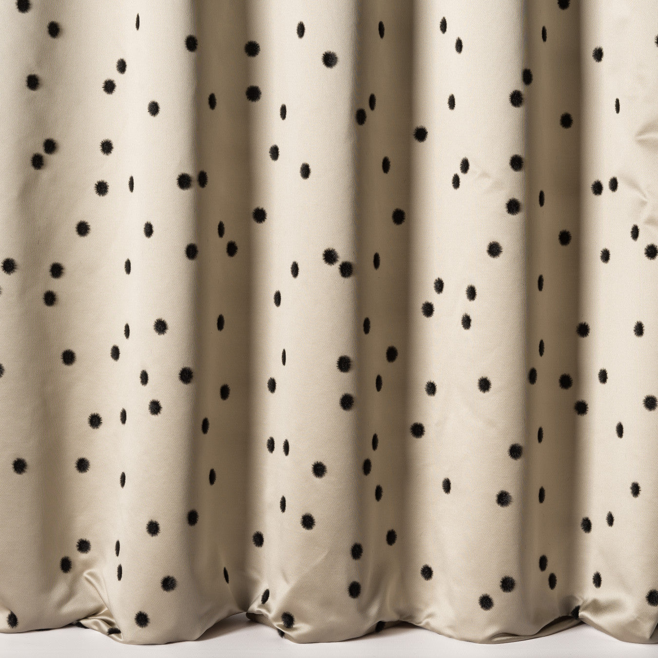 Description: Made in Italy, the sublime satin background, dense and shimmering, of Prélude is animated by small black flocked polka dots, and is reminiscent of the famous dresses of Christian Dior, in the 1950s. Combining poetry and delicacy, Prélude is adorned with timeless colors.