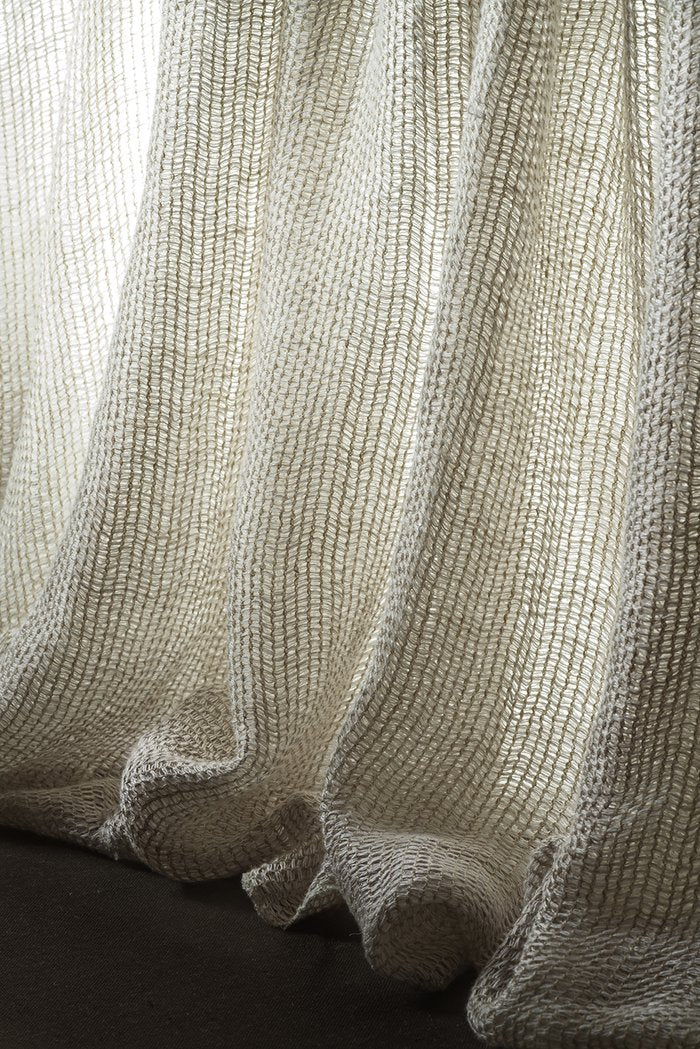 Description: Muse is a double width sheer fabric, with a romantic artist-muse mood. The fine linen yarns work harmoniously together creating an elegant flow and drape. Colours are carefully twist to make a beautiful mouliné effect. Specialised leno weaving techniques are then used, interlacing the delicate linen yarns into a beautiful mesh-like form.