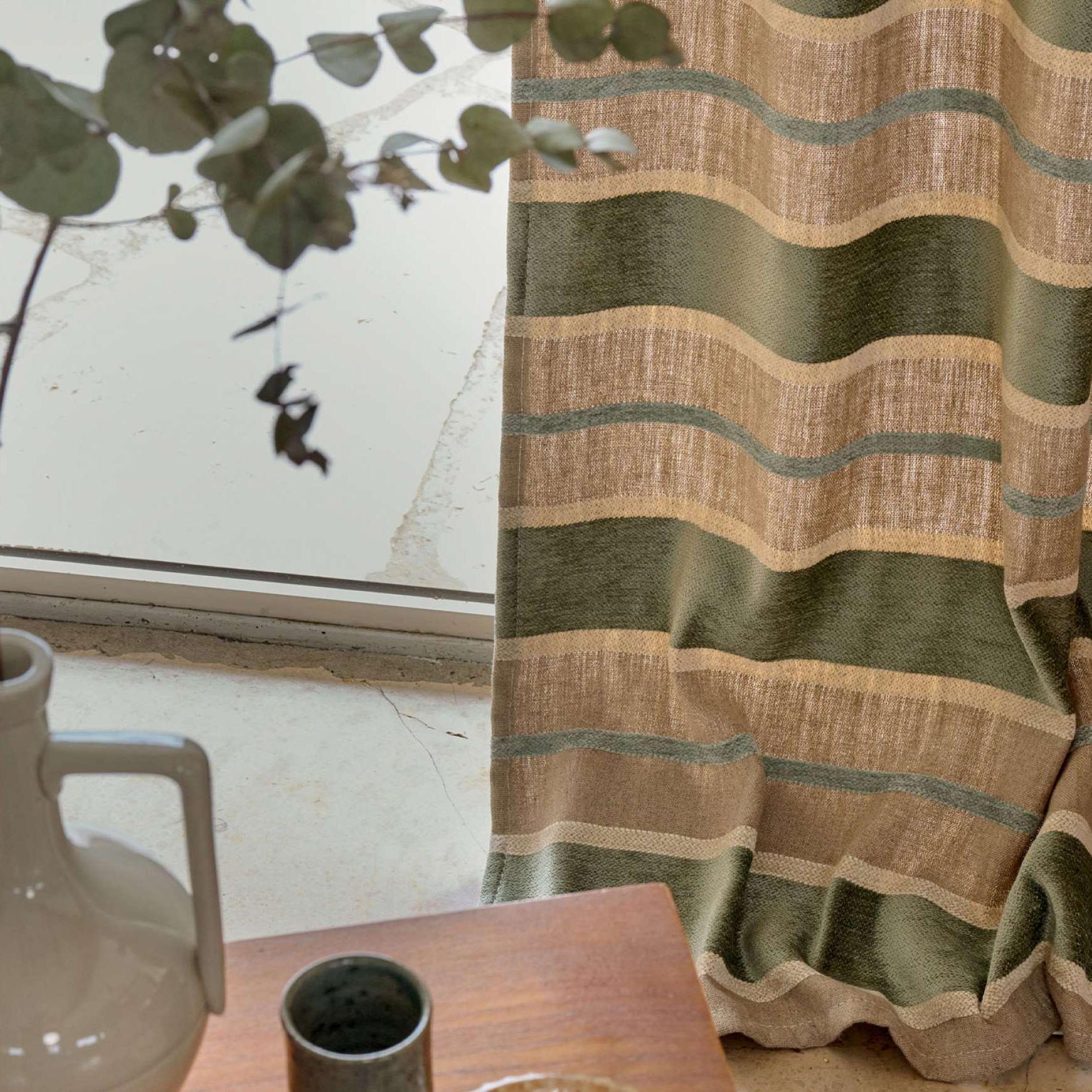 Chenille stripe on linen background, elegant materials, play of matt and shine, beautiful drape, double width