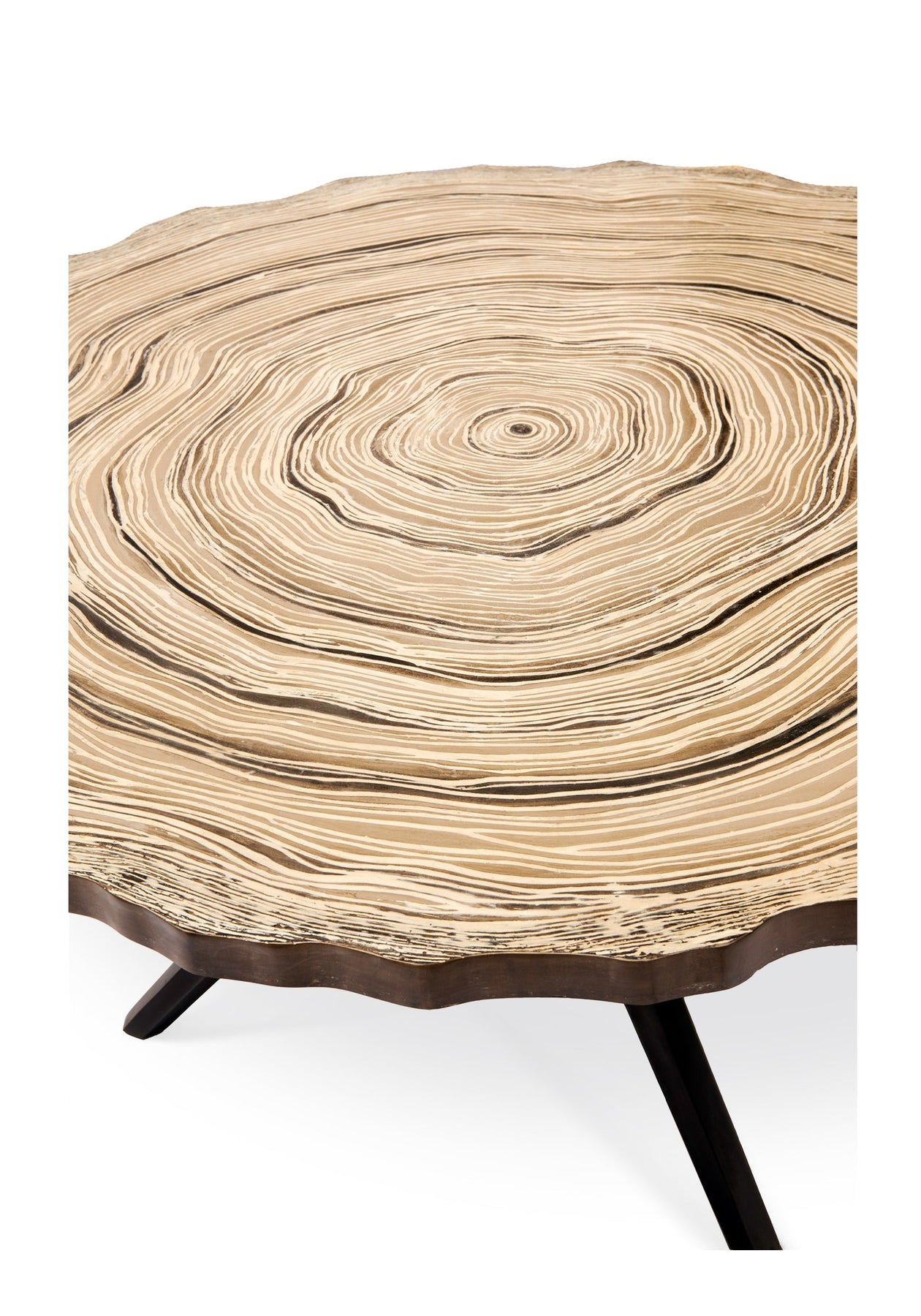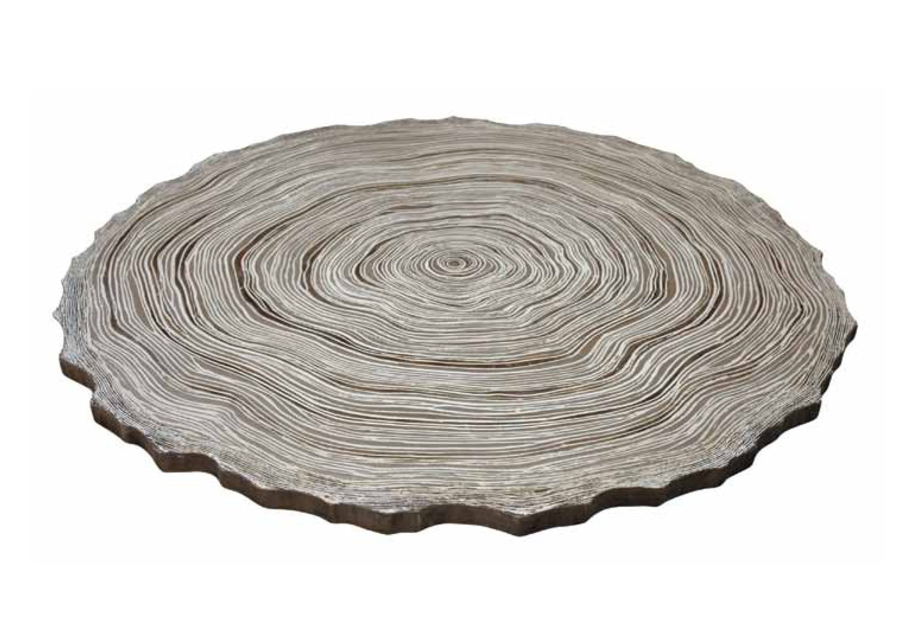 Details: 1 1/2" top with straight edge detail, stylized faux bois pattern with subtle tone on tone color variation, grooved wood grain and irregular edge. Small dimensions: 48" diameter x 1 1/2" thickness. Medium dimensions: 54" diameter x 1 1/2" thickness. Large dimensions: 60" diameter x 1 1/2" thickness. Available in grey, cream colorways. Base available : aslo, jackdaw, mignon, sotto, strider round.