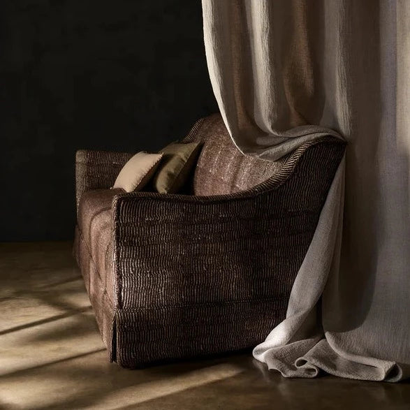 Details: Fine linen yarns are combined with chunky wool to create a heavily textured cloth with beautiful movement. An organic pattern of vertical rivulets reminiscent of mangrove roots meander across the surface creating a cloth with a sense of both structure and movement. This durable and gutsy fabric is suitable for heavy upholstery and is available in four neutral shades from deep brown to soft ecru.